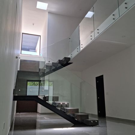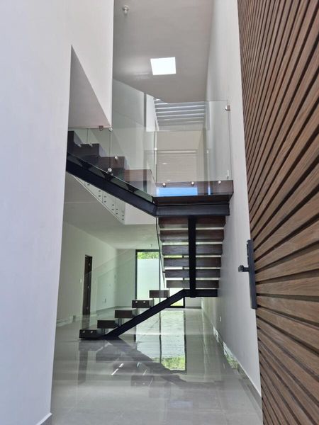 – Escalera con viga de IPR, con escalones de madera de encino con barandal de vidrio