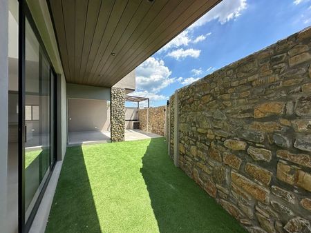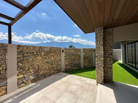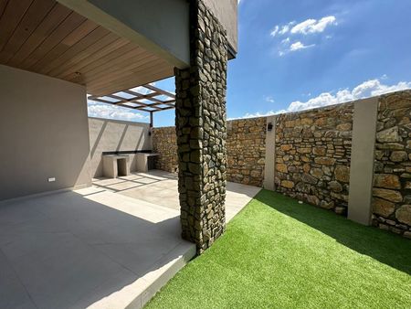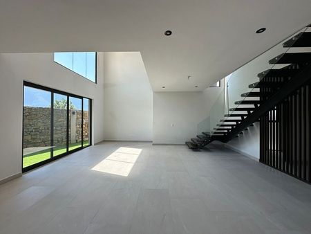 PB: cochera para 3 carros, cocina, sala doble altura y comedor, patio, jardín, area de asador techado, cuarto de servicio, lavanderia, pasillo lateral, medio baño
