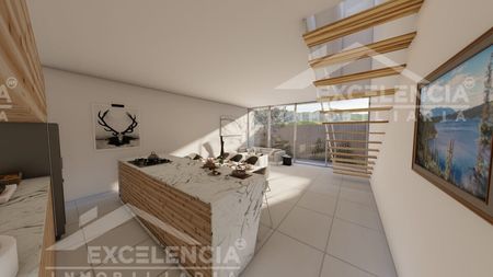 La planta baja consta de sala-comedor con excelente iluminación natural, cocina integral con isla, cuarto de servicio, medio baño, Cochera para 2 vehículos.