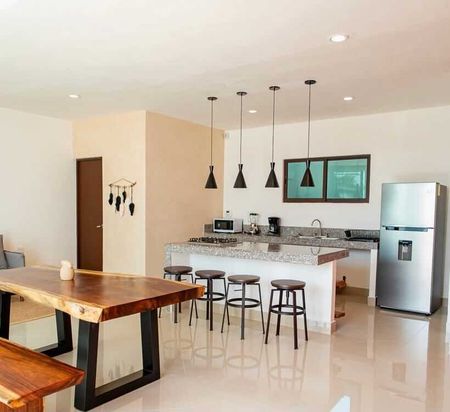 Cocina open plan equipada con estufa, refrigerador, cafetera, micro ondas y