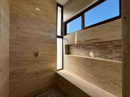 - Recubrimiento en baños con mármol travertino Fiorito en área de regadera.