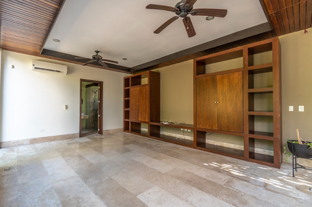Sala de televisión amplia con mueble empotrado de madera