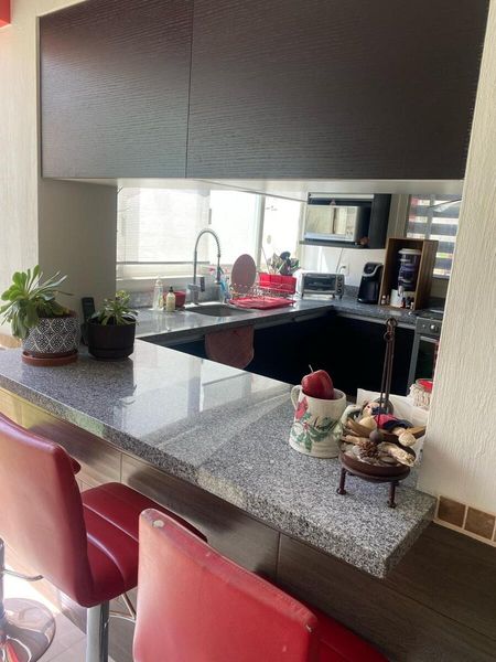 Cocina integral amplia con cubierta de granito y barra desayunadora.