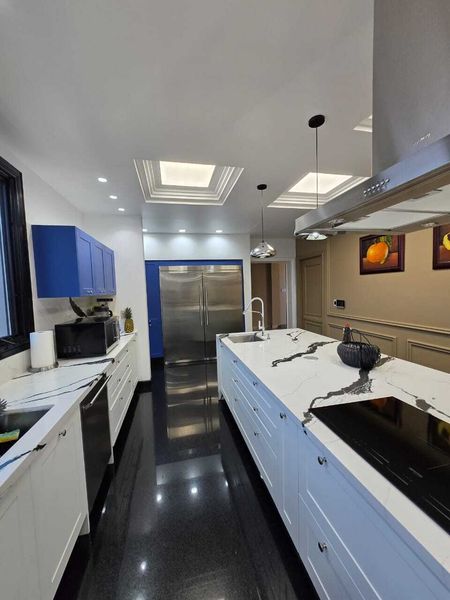 - La cocina está equipada con electrodomésticos de alta gama y cuenta con una isla central