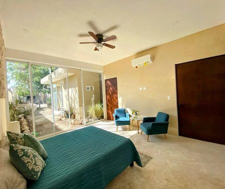 Consta de: Habitación principal con baño completo, closet vestidor, dos jardines interiores, vista a la terraza, aire acondicionado y ventilador.