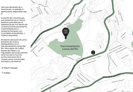 Hermoso desarrollo de 4 townhouses, no pierdas tu oportunidad, disponibles solo 2! Conjunto que proponen ser el marco perfecto para disfrutar la experiencia de vivir dentro de un exclusivo fraccionamiento caracterizado por su ambiente tranquilo, con incontables amenidades, y máxima seguridad. Excelente ubicación en zona poniente de la Zona Metropolitana, en el Fraccionamiento Lomas del Rio, Naucalpan de Juárez, Estado de México.