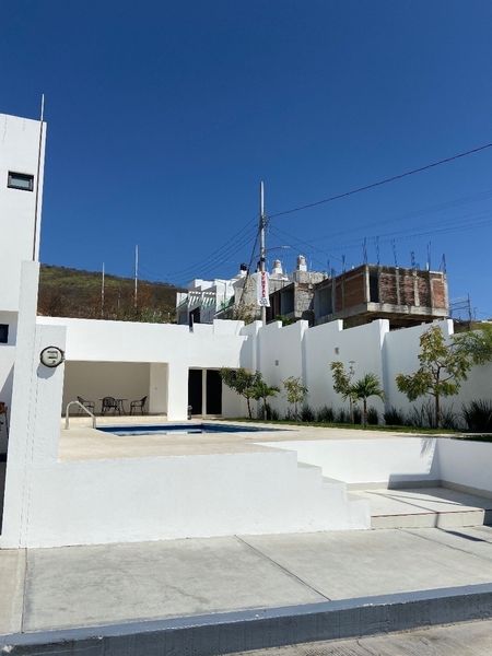Alberca común y área de reuniones con baños.