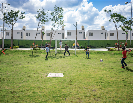 La privada cuenta con vigilancia 24/7 y amenidades como cancha de Fut5, área de juegos, pista de trote, porta bicicletas y bancas de estar.