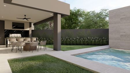 Recibidor, sala-comedor, cocina con amplia alacena, baño completo, cuarto de servicio, lavandería, aplio patio con terraza con alberca y cochera para dos carros con bodega.