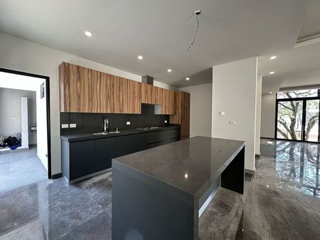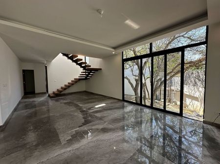 Casa en fraccionamiento privado con piso de mármol en acabado, clima central en pb, plafoneria, cocina integral, jardín, cancelaría en baños, cisterna, minisplits en PA, techos altos en PA