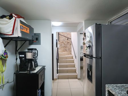 El acceso principal en planta baja cuenta con una puerta metálica, al interior se encuentra el recibidor con un medio baño, cocina integral con encimera de granito y equipado con Estufa y Refrigerador, sala y comedor con puertas corrediza para accesar al área de lavado techada con material traslucido para permitir entrar luz natural.
