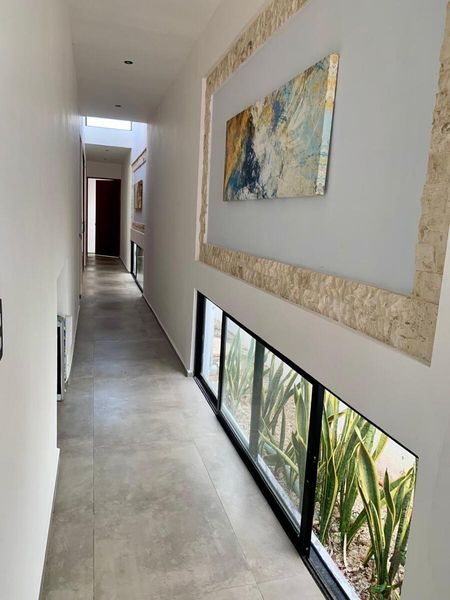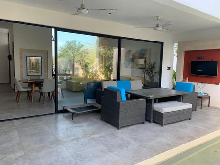 Incluye sala, comedor y cocina integrados con isla; terraza con vista a la alberca y al jardín; alberca central; tres recámaras con baño y salida directa al exterior; además de cuarto de servicio y área de lavado. Planta Alta
