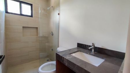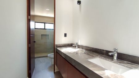 Recámara principal con área de closet vestidor y baño completo con doble lavabo.
