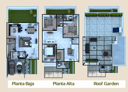 Cuenta con sala, comedor, jardín con asador, medio baño de visitas, roof garden, cuarto de lavado y cuarto de servicio.