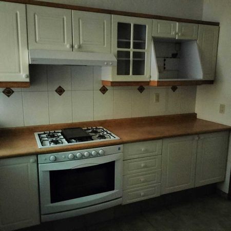 Cocina integral con alacena y barra de servicio hacia comedor