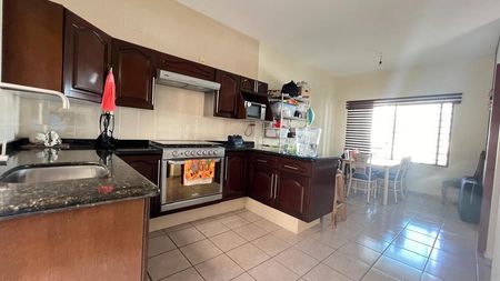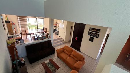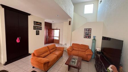 Planta baja: Cochera para 3 autos, bodega, sala, medio baño, comedor, cocina integral, desayunador, despensa, cuarto de servicio con baño completo, área de lavado, jardín amplio con arboles frutales.