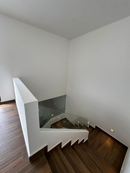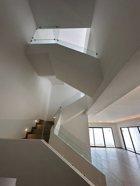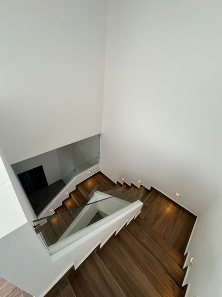 Escalera iluminada con luz cálida y pasamanos de cristal