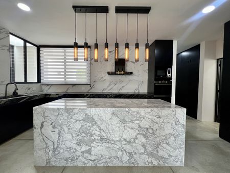 Carpintería en toda la cocina y recubrimiento en mármol calacatta y granito leather