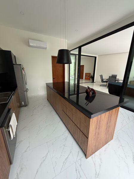 Cocina moderna y funcional: Con una gran isla de granito que sirve como barra desayunador con vistas al jardín.