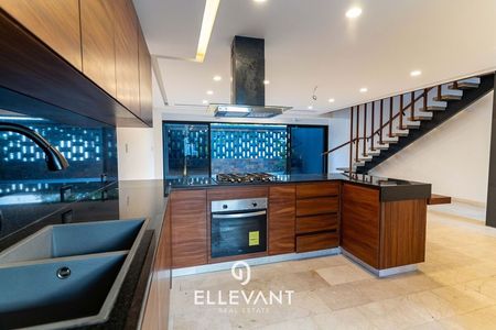 - Cocina integral equipada con estufa, horno, campana, barra de granito y desayunador de parota.