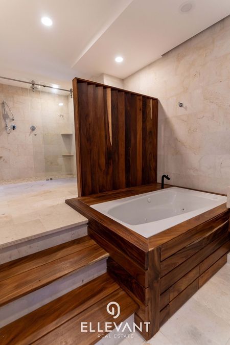 - Terraza con pérgola, tarja Jacuzzi para 8 personas (48 mt2). Detalles: Pisos de mármol marfil, madera parota, aluminio serie 4500, preparación para voz y datos, A/A inverter, vidrio laminado en barandales, vidrio templado en canceles.