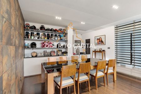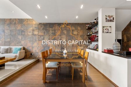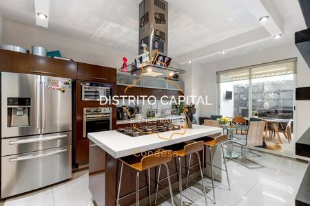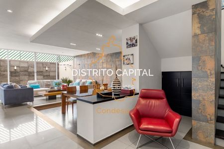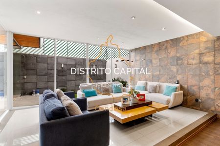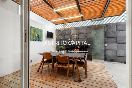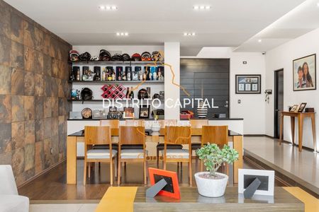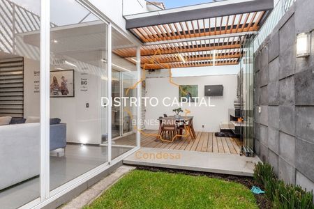 En el jardín, se ha diseñado un área de reuniones única, que destaca por su moderno techo apergolado de acero recubierto con vidrio templado, proporcionando protección contra el clima sin sacrificar la luminosidad natural. Este espacio, con su piso de duela de madera y una acogedora chimenea, es el lugar perfecto para eventos sociales o simplemente para relajarse en un ambiente cálido y sofisticado. La puerta plegable de vidrio templado permite integrar este espacio con el jardín, creando una atmósfera abierta y versátil.