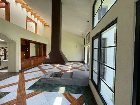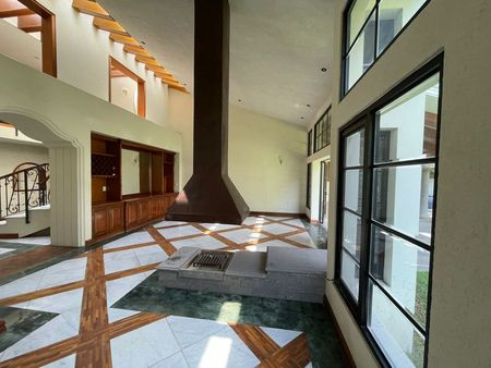 •sala a doble altura con vista al jardín cava de vinos, librero y chimenea