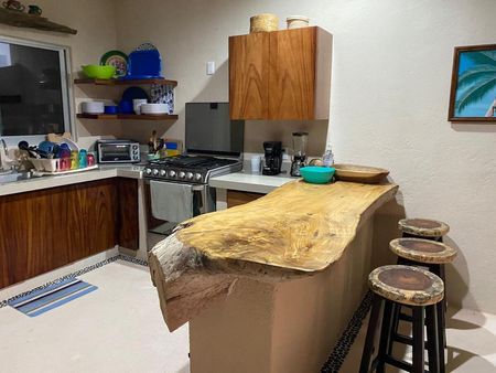 Cocina totalmente equipada con gabinetes y puertas de parota