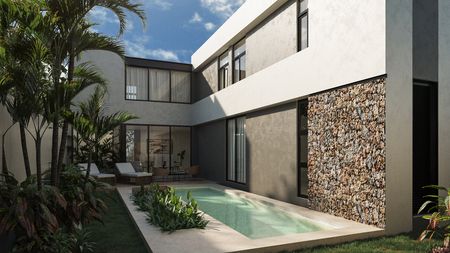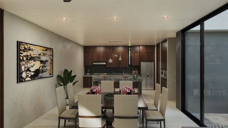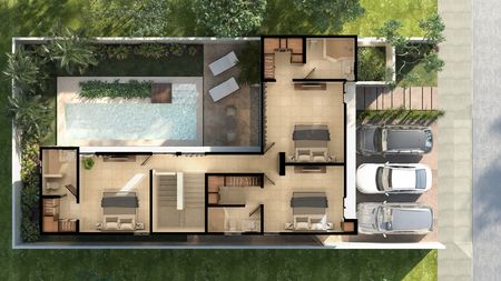 (una en planta baja con closet y 3 en planta alta, cada una con closet vestidor), piscina de 2x 8m, estacionamiento para 3 autos y cocina integral.