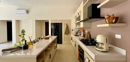 - Cocina con isla, alacena, meseta de servicios, como área de parrilla y tarja que incluye parrilla a gas de 5 quemadores, campana, horno a gas, mesetas de cuarzo blanco