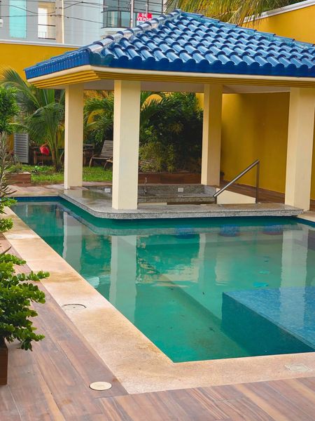 - Pool bar junto a una alberca rodeada de un hermoso jardín, creando un ambiente relajado y exclusivo.