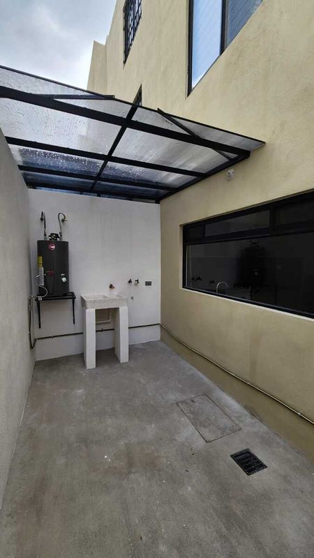 En el primer nivel, te recibe un medio baño ideal para visitas, seguido de una zona social amplia y luminosa donde converge la sala, el comedor y una cocina integral moderna con barra en color negro y grandes espacios de alacena. Al fondo, el patio con área de lavado techada hace más prácticas las tareas diarias.