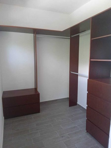 1 Recámara con closet de madera y base matrimonial.