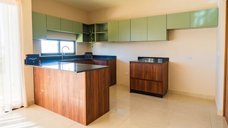 * Barra de granito y gavetas inferiores en la cocina.