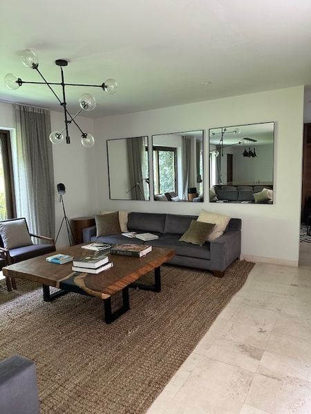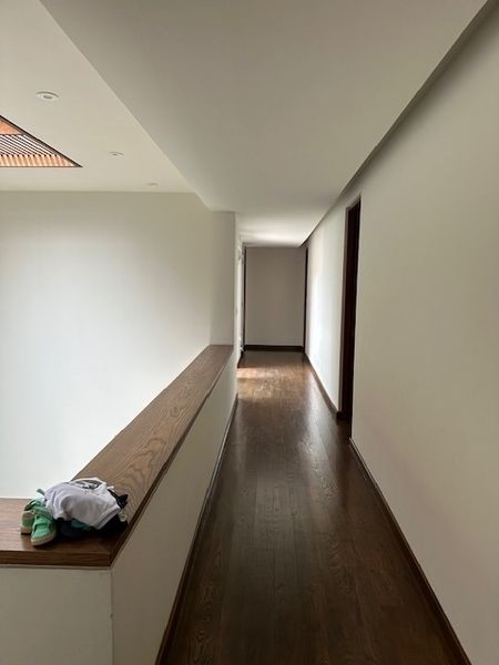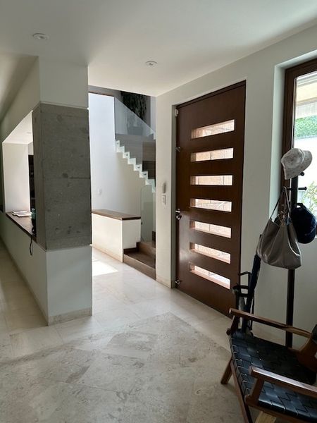 Escaleras a doble altura con domo y pasamanos de cristal, 4 recamaras, 3 con baño y vestidor y la principal con balcón además cuentan con una segunda sala de tv.