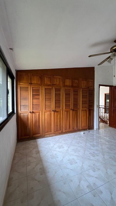 - Recámara principal equipada con ventilador de techo, closet de madera y baño completo.