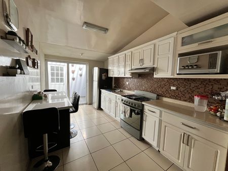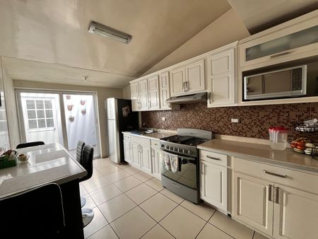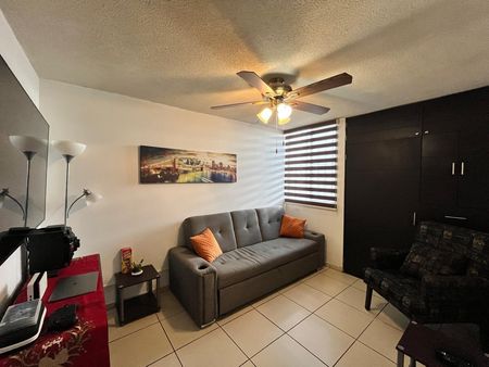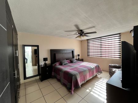 Sala, comedor, cocina, patio de servicios con cuarto de lavado, cuarto de televisión con closet, un baño completo, bodega.