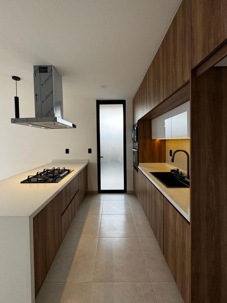 El corazón de la planta es una cocina equipada con barra de cuarzo, cajones de cierre lento y alacena independiente, conectada a un comedor con gran entrada de luz y ventilación. La sala, con vista al jardín trasero, ofrece un ambiente cálido y social. También cuenta con medio baño para visitas y una práctica área de lavado discretamente ubicada.