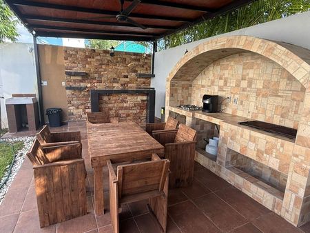 área social techada con asador, estufa, barra, juegos de mesa, hamaqueros