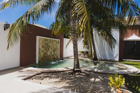 - Patio con jardín y plantas de ornato, junto y alrededor de la alberca.