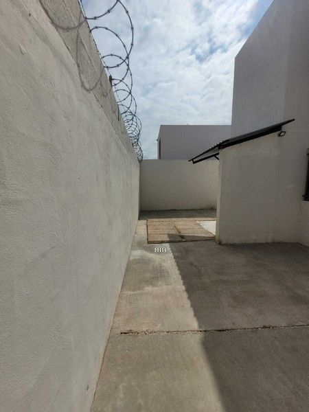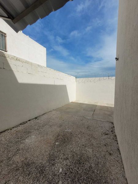 Patio trasero pavimentado, con área de lavado techado, batea y su desagüe.