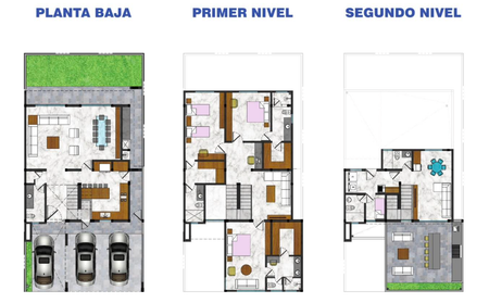 En planta baja encuentras cochera para 3 autos, recibidor, baño de visitas, cocina con concepto abierto, sala, comedor, jardín y bodegas.