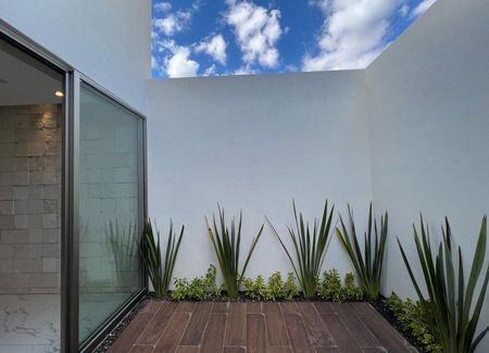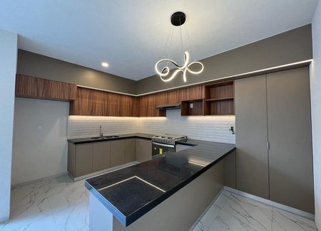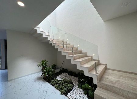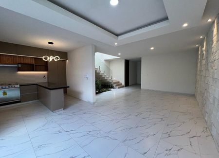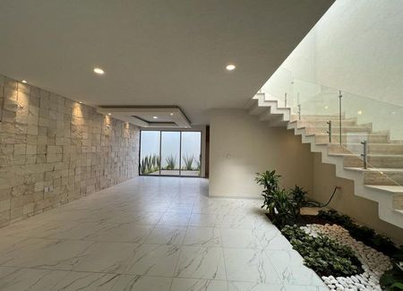 Planta baja: sala, comedor, cocina de concepto abierto con cubiertas de granito, estudio o 4ta recámara con baño completo, terraza, cuarto de lavado y cochera para 2 autos.