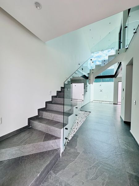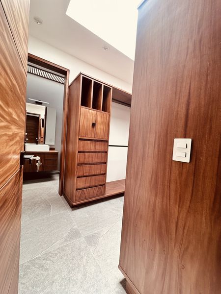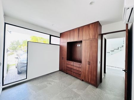 La casa tiene 1 recámara principal con vestidor y baño completo propio, 2 recamaras secundarias con closet y su baño completo para compartir, una recámara en planta baja ideal para oficina o estudio con baño completo y clóset.