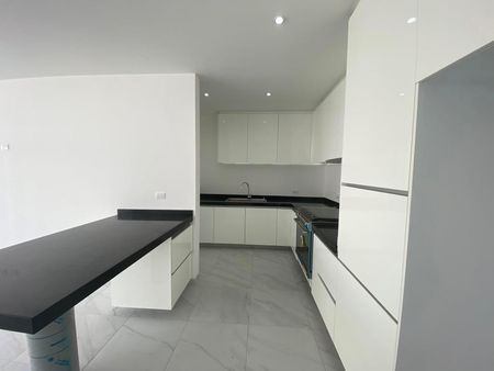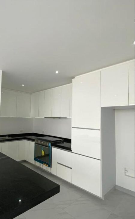 -Cocina integral equipada con barra desayunador con cubierta en granito negro y alacenas al alto brillo