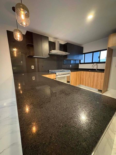 Cocina equipada con: Tarja, horno y parrilla de acero inoxidable; campana de isla con acabado cristal/acero inoxidable.
