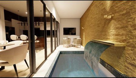 Planta Baja: Cochera techada para 2 autos, una habitación, cisterna de 10 mil litros, sala, cocina, comedor, Baño y alberca.