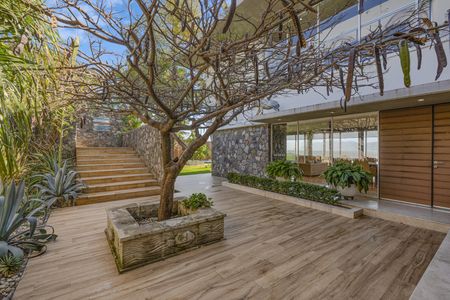 Propiedad estilo contemporánea con una hermosa fachada de piedra, su entrada por la calle una gran puerta de acero y unas amplias escaleras que te llevan directamente a la entrada principal, decorada con un hermoso árbol Tabachín.