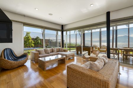 *Una terraza cerrada con puertas corredizas y con una vista panorámica al lago