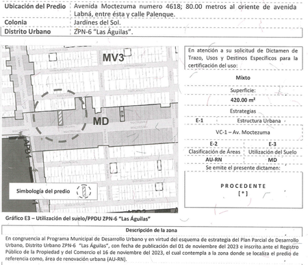 COS: 0.8 / CUS: 4 → Potencial para construir hasta 1,680 m² en 5 niveles. Ver dictamen anexo